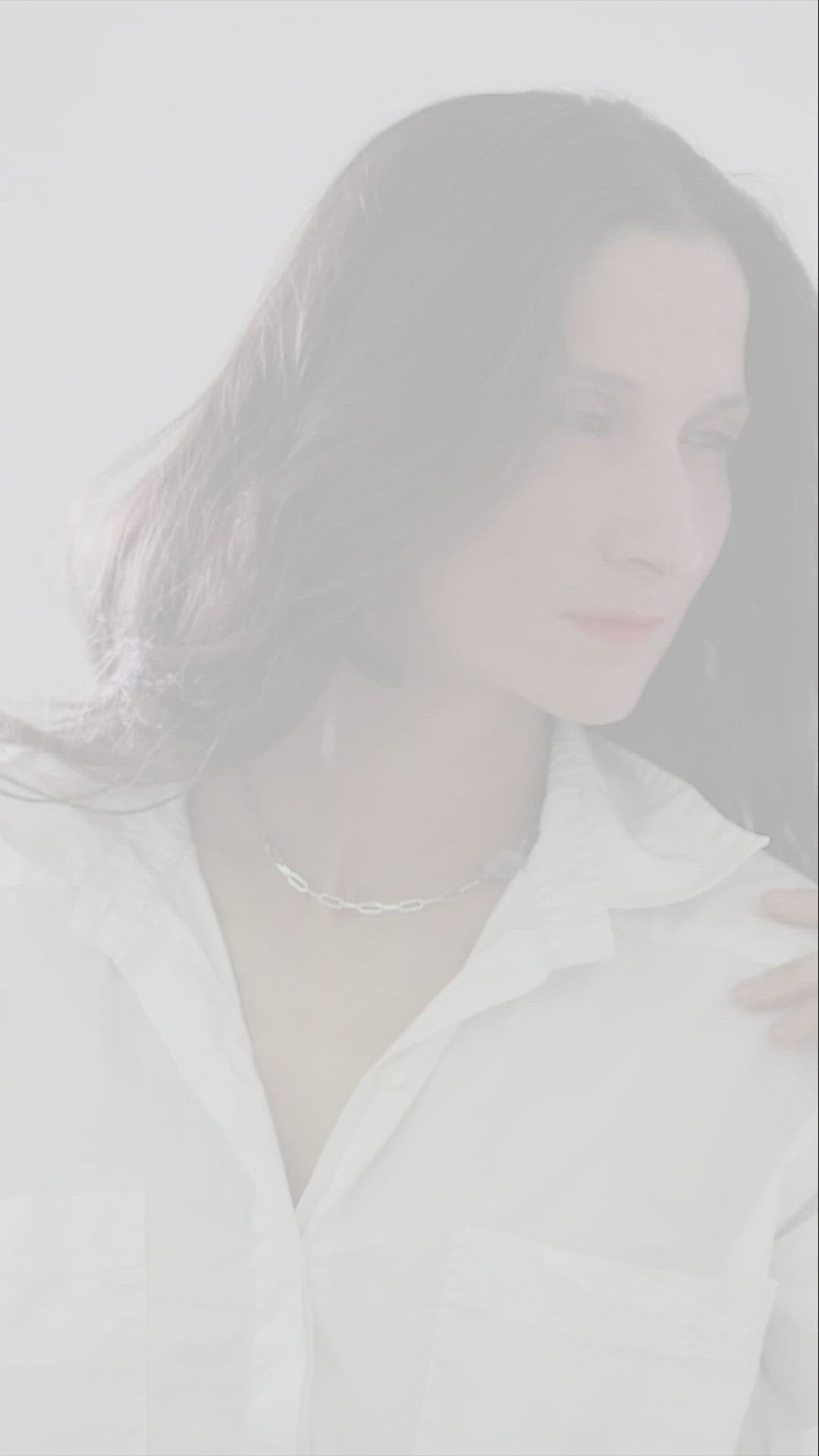 A lightweight paperclip adjustable steel chain links up a hand chiseled, titanium dusted, clear quartz crystal. Shimmering cool tones bring mystical vibe to this contemporary piece.