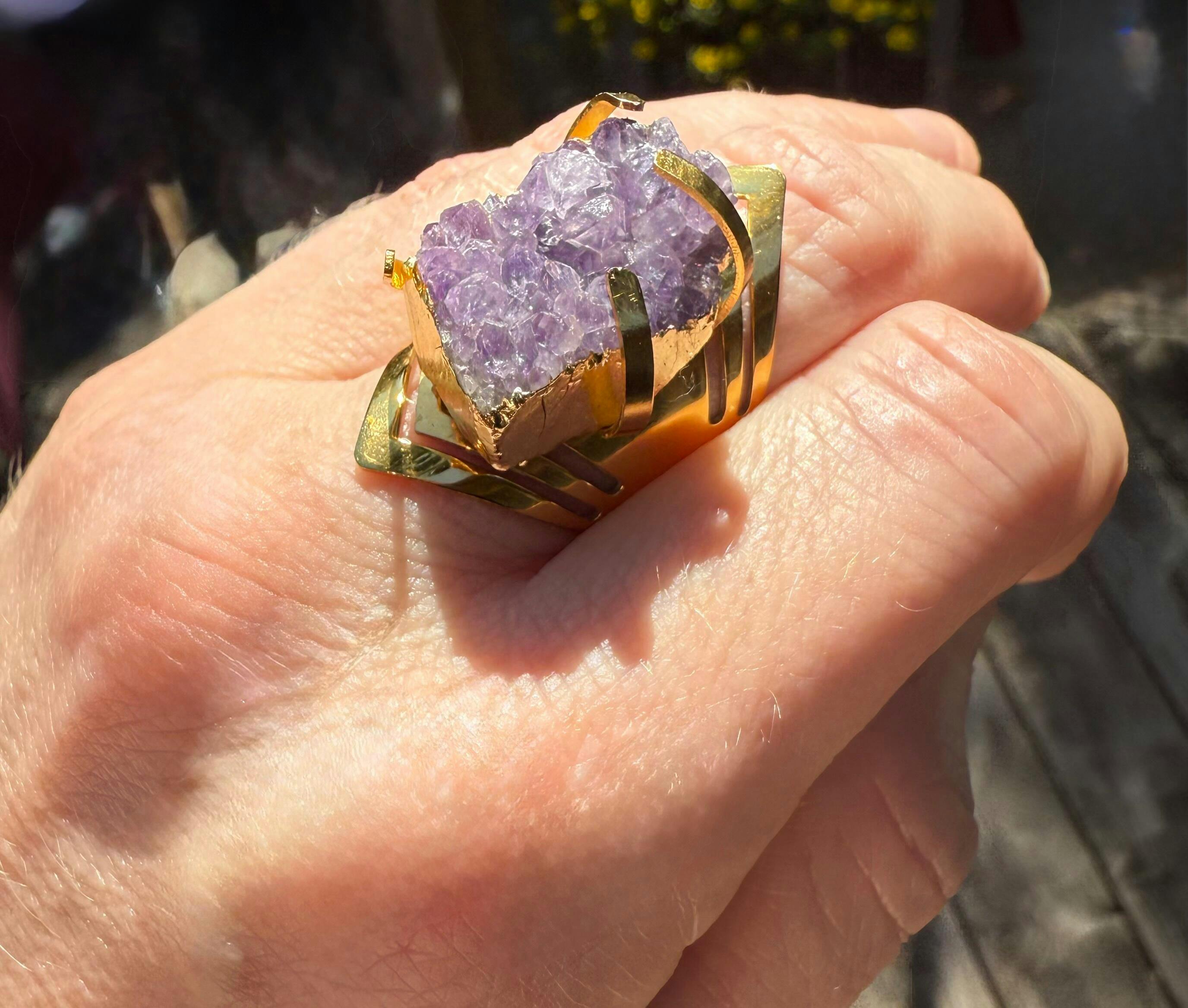 It is a fearless fusion of raw elegance and unyielding strength. Its centerpiece! A one-of-a-kind amethyst druzy rock is as untamed as the energy it channels – unapologetically dramatic, fierce, and unforgettable.